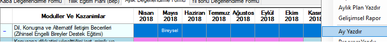 Eğitim Planı>Böp formunda  "Aylık Değerlendirme Formu" sekmesineButonu eklemiştir.