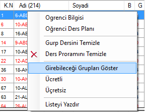 1.Grubu Eksisk olan ogrencinin Mevcut Gruplar arasında ders yazılabilecek seanslarını Gosterir ve  O gruba yerleştirmenize izin verir.