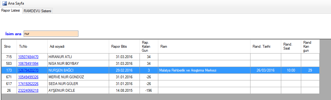 2. Daha önceden Bir randevu alınmış ise program içinde takibi için